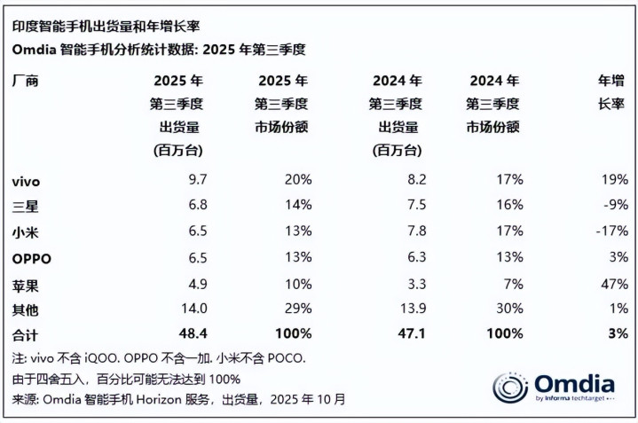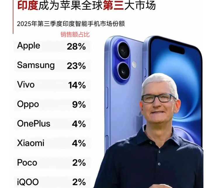 从市场方面,今年苹果在印度的表现也非常出色,2025年三季度时,苹果在印度的销量,已经进入了前五名。